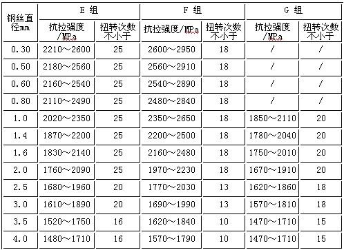 該標(biāo)準(zhǔn)規(guī)定鋼絲分甲、乙、丙3組供貨。丙組適應(yīng)于較高應(yīng)力彈簧,乙組適應(yīng)于高應(yīng)力彈簧,甲組適用于超高應(yīng)力彈簧。標(biāo)準(zhǔn)推薦鋼絲采用T9A,T10A和T8MnA制造。實(shí)際上鋼絲抗拉強(qiáng)度隨碳含量增高而上升,扭轉(zhuǎn)性能(韌性指標(biāo))隨碳含量上升而下降,綜合考慮,遼寧特殊鋼集團(tuán)大連三大鋼絲公司選用加稀土的T9A鋼絲生產(chǎn)甲、乙、丙組鋼絲。成品鋼絲考核抗拉強(qiáng)度、扭轉(zhuǎn)、扭轉(zhuǎn)斷口、纏繞、抗拉強(qiáng)度均勻性和尺寸均勻性六項性能指標(biāo),常見規(guī)格的力學(xué)性能如表6。